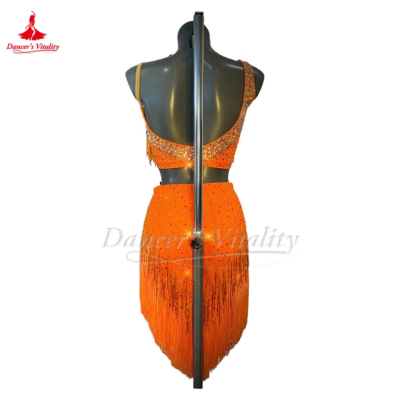 Crafted in stretchy spandex with sparkling AB stones, this Latin dance performance dress features a figure-hugging silhouette and a fluid tassel skirt that enhances every turn for Jive, Samba, Chacha, Rumba, and Paso Doble. Designed for competition and stage, it offers customizable sizing, breathable comfort, and easy care—hand wash cold and lay flat to dry.