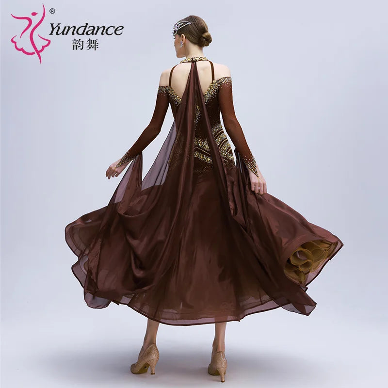 Crafted in high-quality coffee chiffon with refined rhinestone detailing, this custom standard ballroom dress is tailored to your measurements for a secure, elegant fit and fluid movement on the floor. Ideal for competitions and stage performances, the lightweight fabric and performance-focused construction enhance comfort; handle with care—gentle hand wash and air dry recommended.