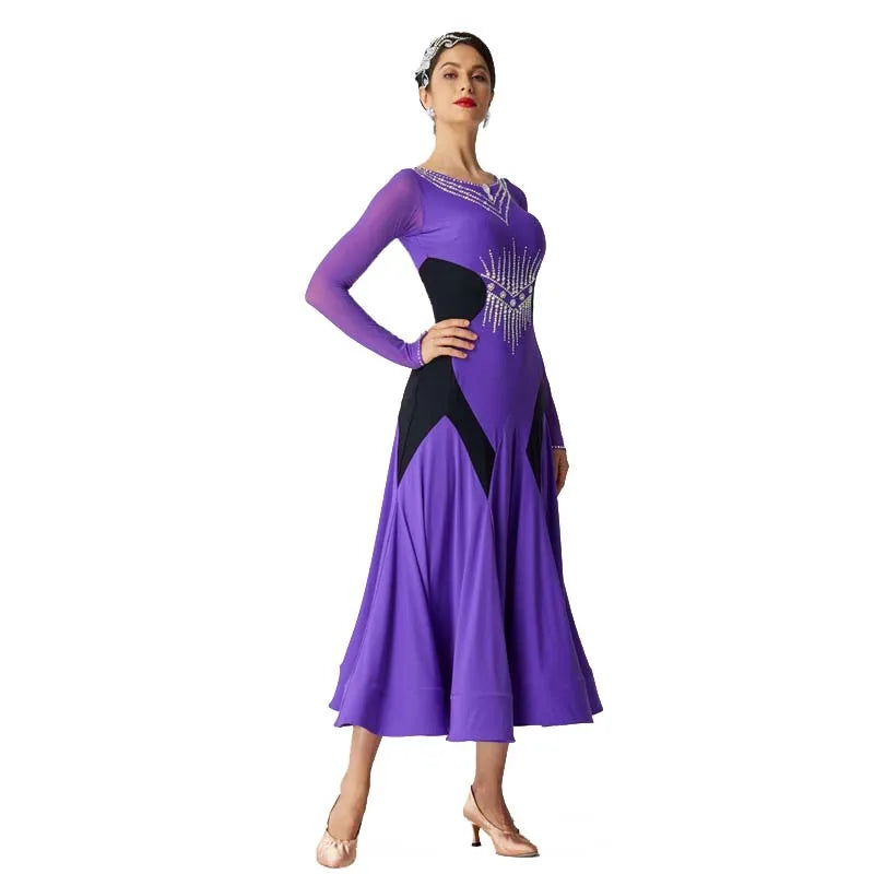 Designed for ballroom practice and competition, this long dress pairs a stretch lycra bodice with a flowing organza skirt for elegant movement in waltz and standard routines. The supportive, flattering fit allows unrestricted motion, while breathable, easy-care fabrics offer comfort; gentle hand wash and air dry recommended.