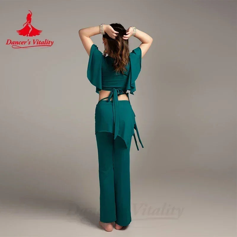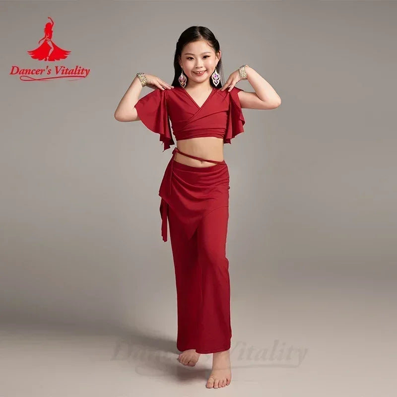 This elegant royal blue wrap top and asymmetrical skirted pants costume set is perfect for belly dance performances, offering a stylish fit with comfortable fabric. Ideal for young dancers, the set ensures ease of movement while the vibrant color adds a touch of charm to any performance.