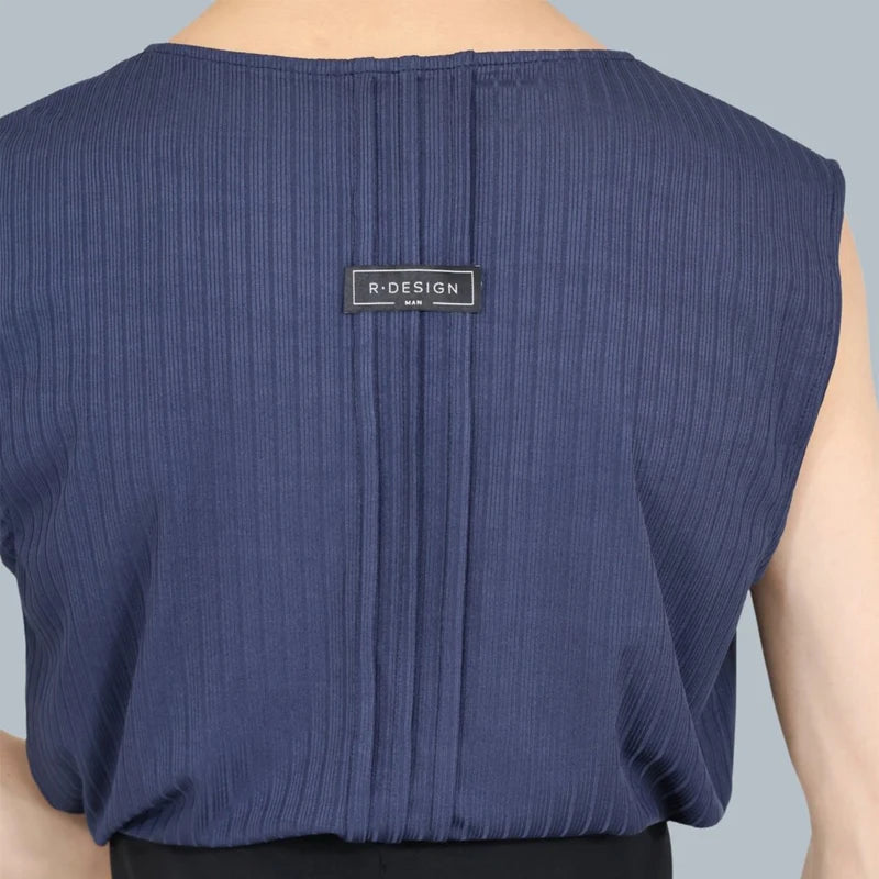 This dancewear ensemble features a gray and navy ribbed sleeveless Henley top paired with high-waisted black pants, designed for modern, lyrical, and contemporary ballet performances. Crafted from breathable materials, the outfit offers a comfortable fit with excellent stretch, ensuring ease of movement and durability during performances.