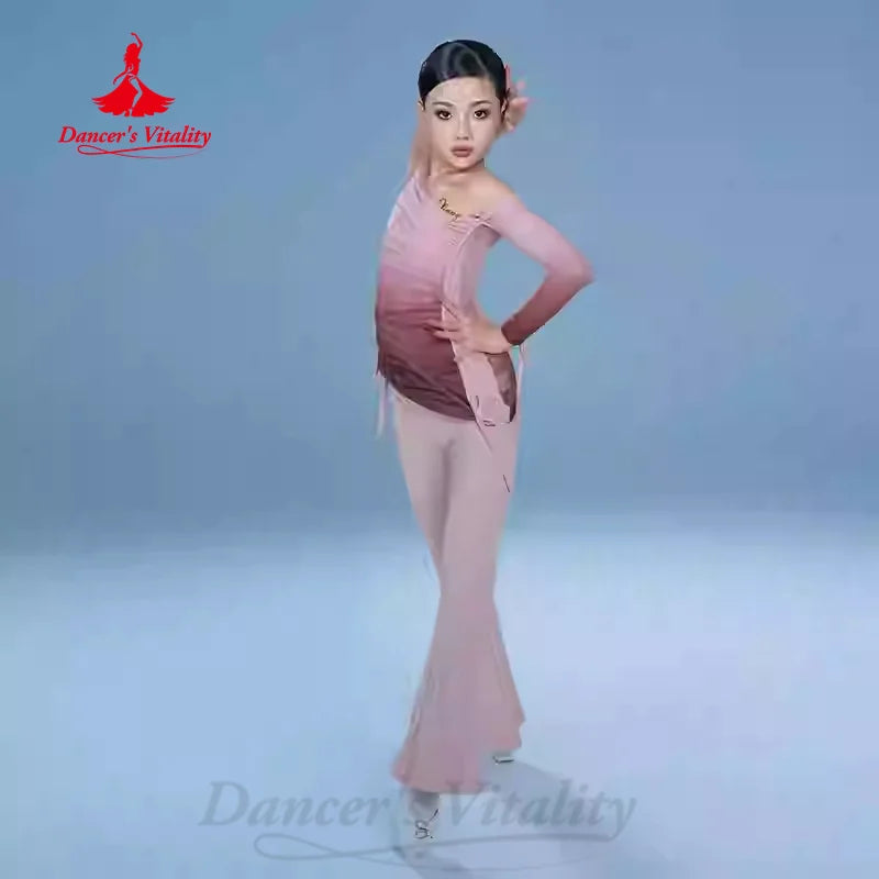 Girls' Ombre One-Shoulder Mesh Latin Dance Top and Flared Pants Set - Brown/Beige, Ruched, Long Sleeve