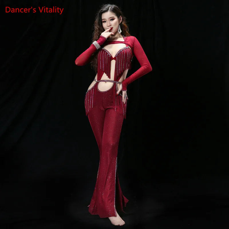This black sparkle jumpsuit features a halter neck design and fringe cutouts, perfect for belly dancing or evening wear. The slit leg adds a touch of elegance, and its fabric provides comfort and flexibility.