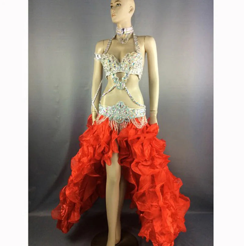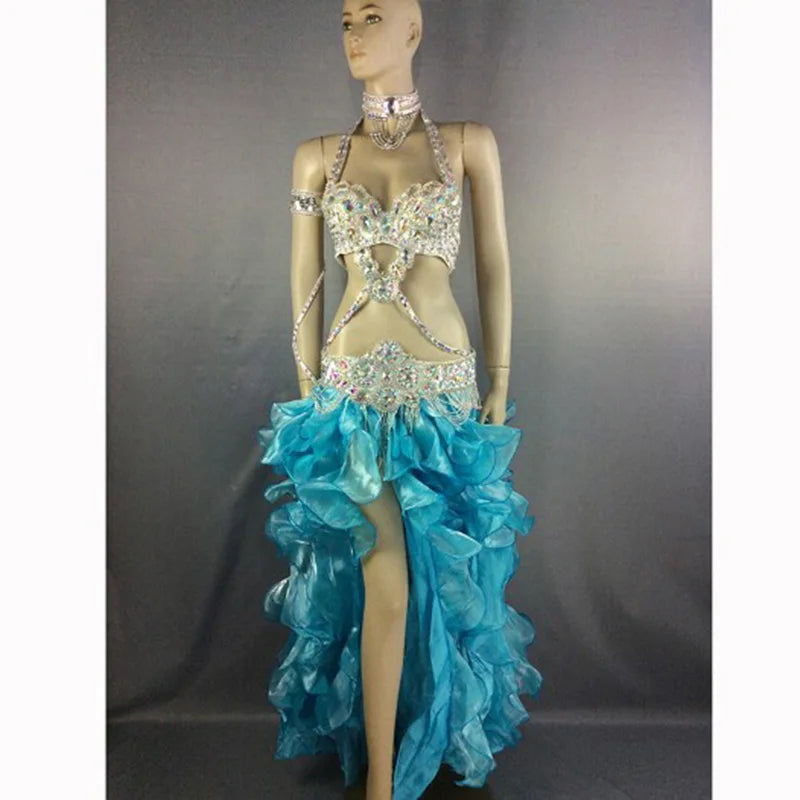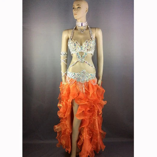 This women's belly dance costume set is elegantly designed with white sequins and rhinestones, featuring a versatile halter neck and an eye-catching ruffled high-low skirt. Ideal for stage performances, it combines style and comfort, ensuring free movement and flexibility.