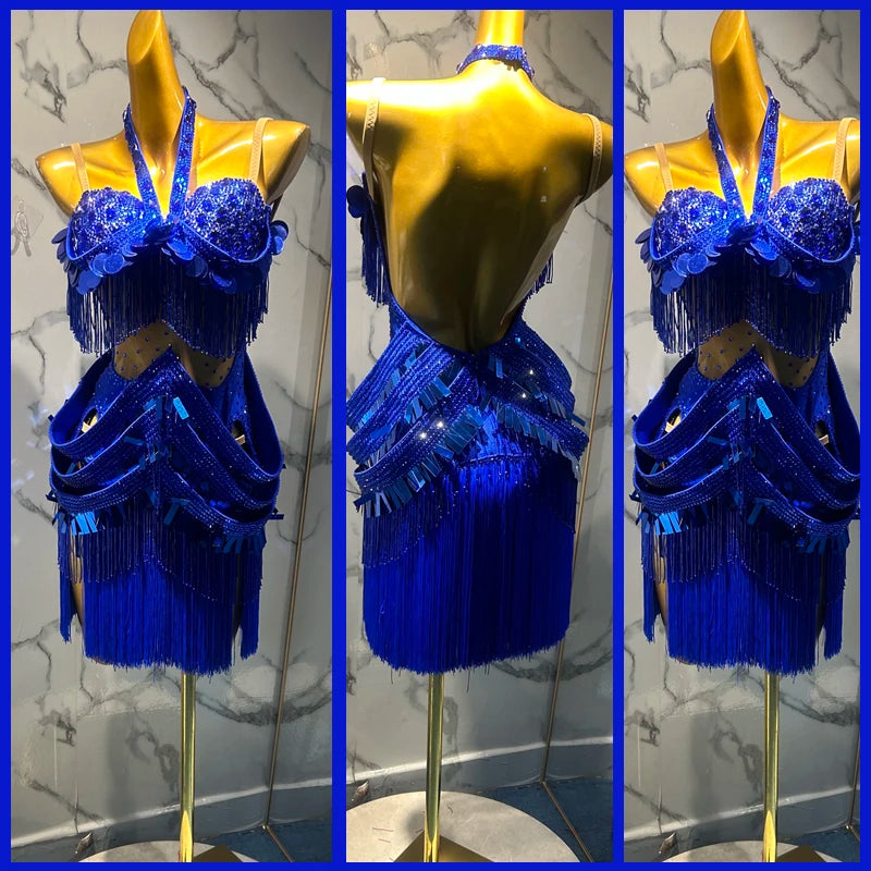 This elegant dress for women features a stunning teal sequin fringe design with a halter neckline and backless style, perfect for rumba or samba dancing. Hand-crafted to ensure unique quality, it offers slight stretch for ease of movement and requires careful handling and care.