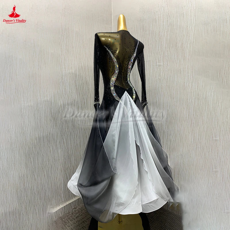 This elegant ballroom dance performance dress is crafted from stretchy spandex for ultimate freedom of movement and features a black and white ombre design embellished with crystals. Available in an inclusive size range from XXS to 6XL, with custom sizing options, it offers the perfect fit for every dancer.