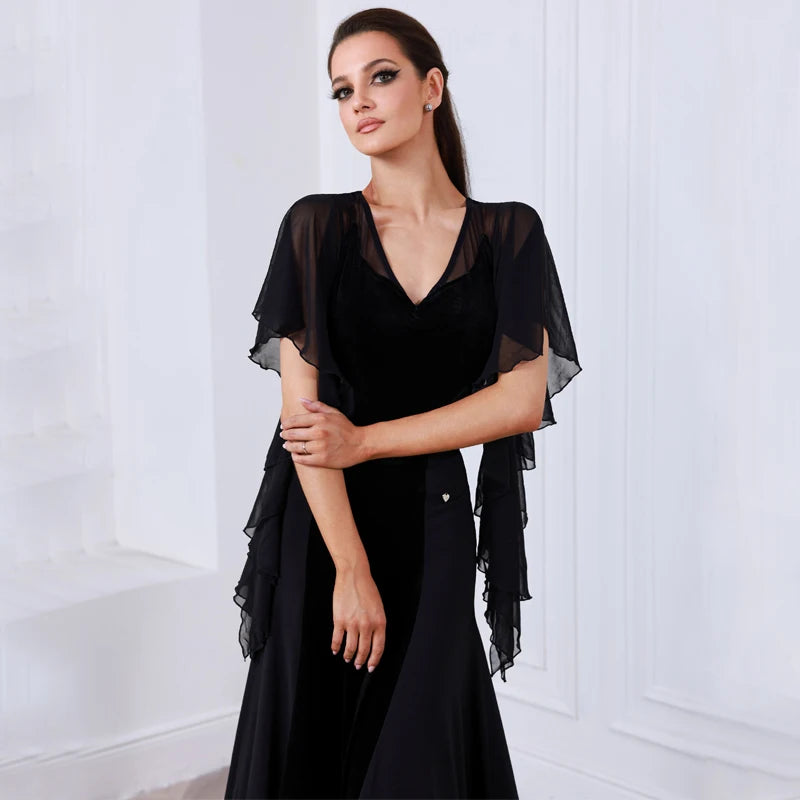 This elegant black ballroom dance dress features a luxurious velvet and chiffon fabric with a flattering V-neck and flutter sleeves, perfect for formal dance events. Designed with care for easy movement, it offers a tailored fit while remaining easy to maintain, making it a great choice for any sophisticated dance occasion.