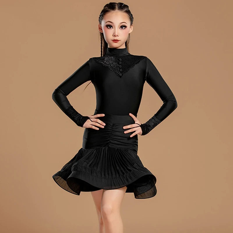Girls' Black Ballroom Dance Dress with Lace Neckline and Ruched Waist, Long Sleeve Latin Dance Skirt