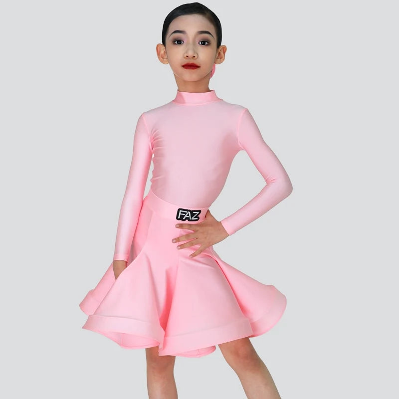 This girls' Latin ballroom dance dress features a mock neck and long sleeves, crafted from a comfortable and stretchy fabric. The pleated skirt design not only enhances movement during dance but also adds a stylish flair, making it ideal for performances and practice sessions.