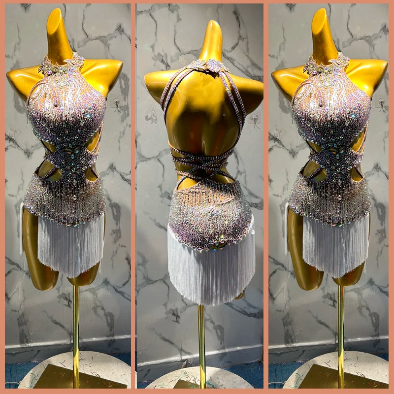 This hand-made Latin dance dress for women features a stylish halter neck and backless design with fringe and sequin accents, perfect for performances like ballroom, samba, rumba, or cha-cha. With its custom fit requiring detailed measurements, it offers a bespoke feel for competitive dancers.