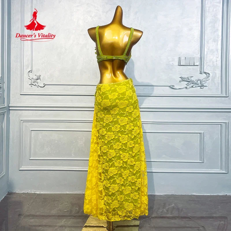 This vibrant neon green dance gown is designed with intricate lace and beaded fringe, offering an elegant silhouette with a backless and slit design perfect for salsa, rumba, or tango performances. The attention to detail and comfortable fit make it ideal for showcasing graceful movements, while its fabric promises durability and ease of care.