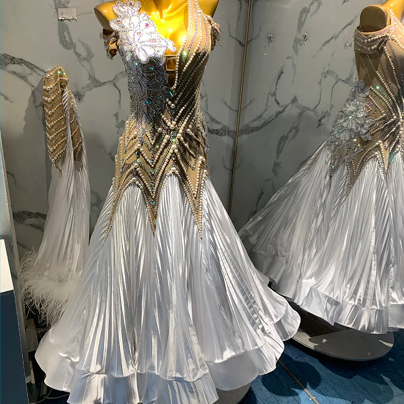 Ballroom Dance Dress Women White Beaded Pearl Pleated Long Gown