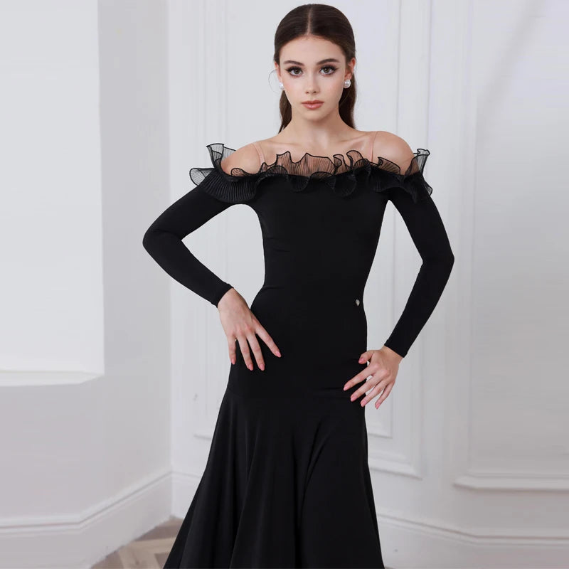 This elegant ballroom dance dress features a black off-shoulder design with ruffles and a mermaid hem, crafted from a stretchy fabric that provides a comfortable fit for standard Latin performances. It is designed for easy care, making it ideal for repeated use in dance competitions or rehearsals.