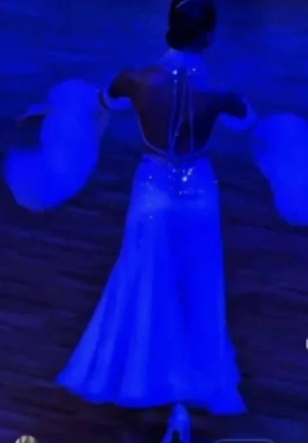 This ballroom dance dress for women features a stunning corset-style bodice adorned with embellishments and elegant feather boa sleeves. The flowing full skirt adds grace, perfect for standard smooth dance performances, crafted for a unique fit with care taken in its customized, hand-made creation.