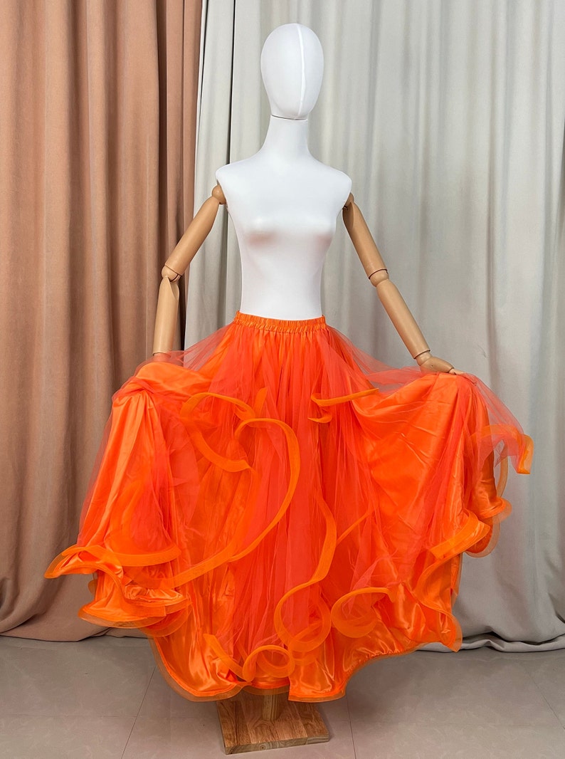 This elegant women's ballroom dance skirt is crafted from stain and mesh, offering a graceful flow as you move. The skirt features an elastic waistband that fits waist sizes from 30" to 44" and is perfect for dance performances or formal occasions.