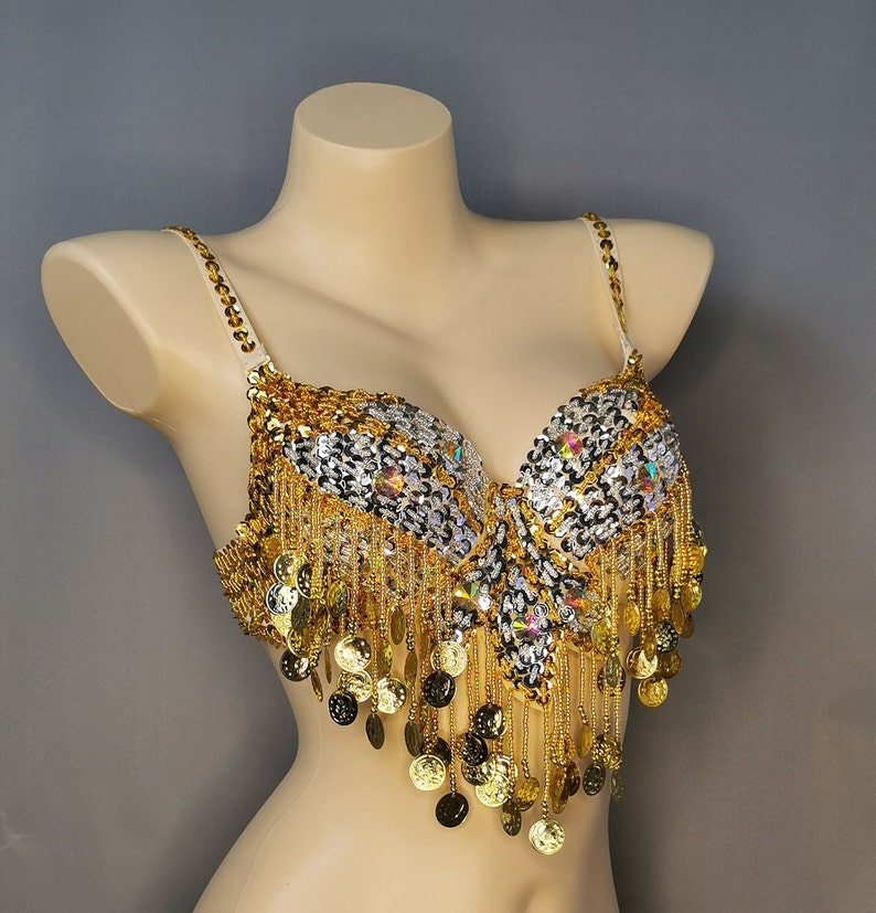 This belly dance bra and belt set features shimmering gold and silver sequins with coin fringe, perfect for tribal performances. Custom size options ensure a flattering fit and hassle-free USPS shipping is available, taking between 15-30 days.