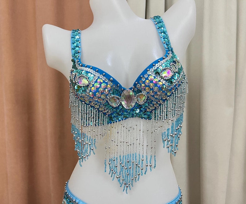 This women's dance top features a dazzling array of sequins and fringe, making it perfect for belly dance performances. Available in multiple colors, the customizable fit ensures comfort and allows you to express your style effortlessly.
