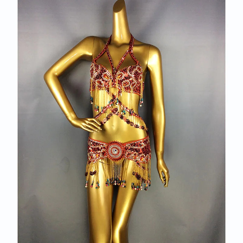 This women's belly dance costume set includes a beaded halter top and hip scarf. Crafted with sequined detailing, it offers an eye-catching appearance perfect for dance performances or festive occasions like Halloween and New Year parties. The set is available in vibrant colors such as red, black, and navy blue, with customizable options to suit different preferences.