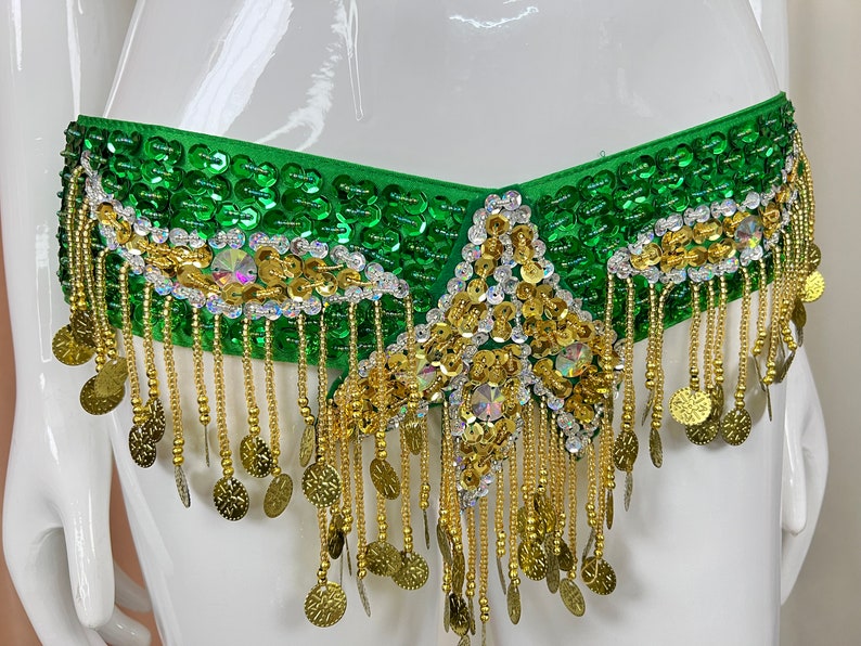 This belly dance costume set features a stunning emerald green and gold sequin design with coin fringe, creating a glamorous look. Customizable for a perfect fit, it's ideal for performances, ensuring both style and comfort.