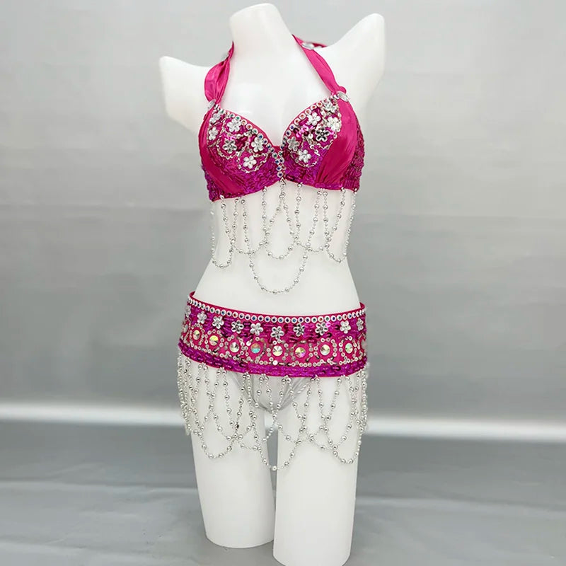 This elegant belly dance costume features a beaded halter bra and hip scarf set, adorned with gold sequins and chain fringe, perfect for both performances and festive events. The set includes a bra, belt, and panty in a versatile silver, with adjustable belt sizes for a comfortable fit.