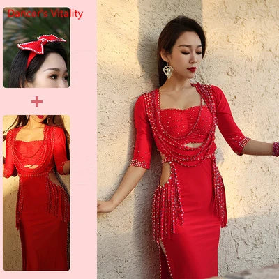 Belly Dance Costume, Women's Olive Green Sequin Embellished Slit Maxi Dress, Satin, Professional Performance Wear