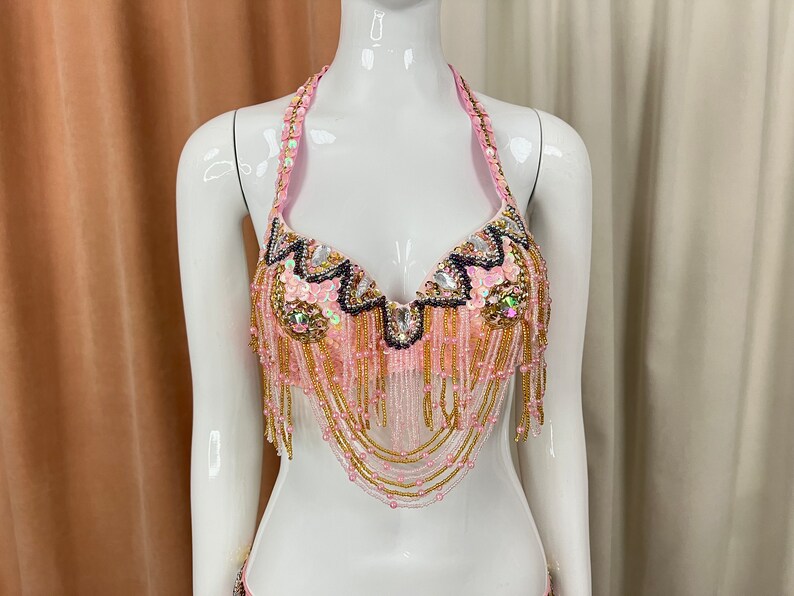This eye-catching belly dance costume includes a beaded sequin halter top and hip scarf set in pink and gold, adorned with tassel fringe for a glamorous performance look. Crafted for both comfort and style, it is tailored to fit various cup sizes, ensuring a personalized fit for your unique measurements.