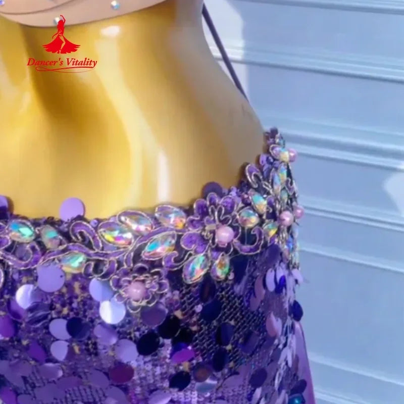 This elegant belly dance costume features a purple sequin halter top and a mermaid skirt adorned with beaded fringe, designed for professional performances. The outfit provides a dazzling and comfortable fit, ensuring both style and ease of movement, perfect for stage use.