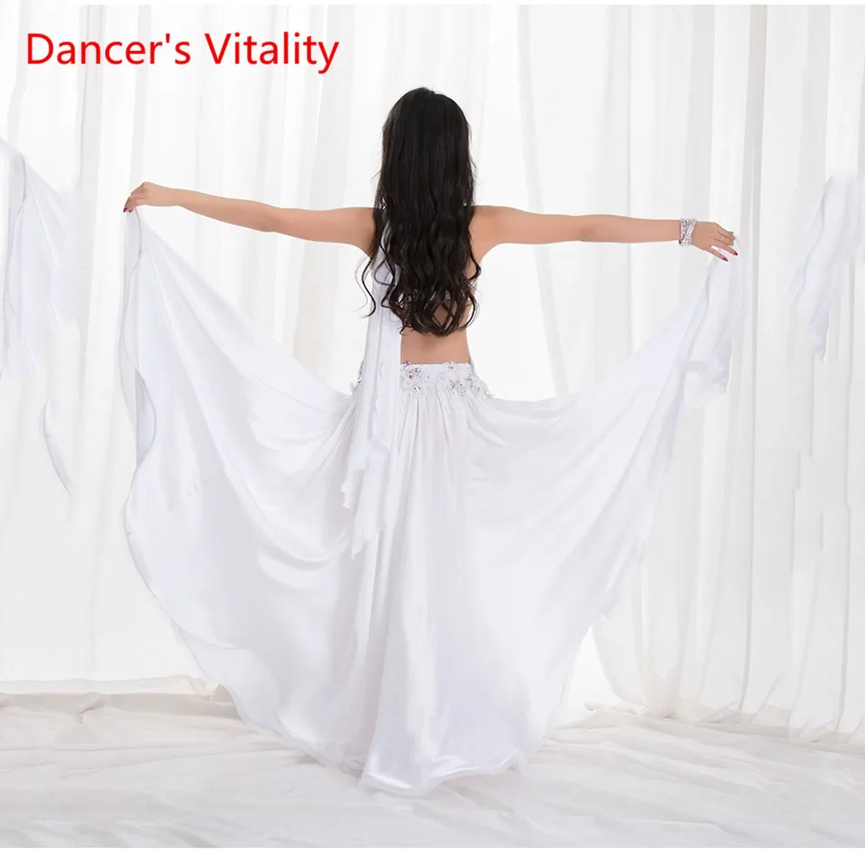 This elegant belly dance costume features a white sequin halter top paired with a high slit chiffon skirt, offering a graceful fit ideal for tribal fusion performances. Its flowy design allows for comfortable movement, while the shimmering sequins add a touch of glam to your dance ensemble.