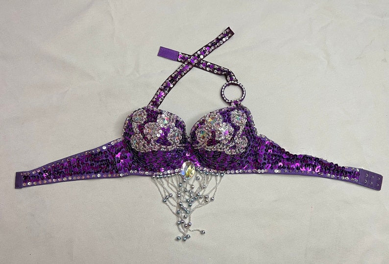 This deluxe halter top bra features intricate white sequins and beadwork, complete with gorgeous rhinestones and a draped fringe, ideal for belly dancing or special performances. Custom sizes are available, providing a comfortable fit with luxurious materials for enhanced flexibility.