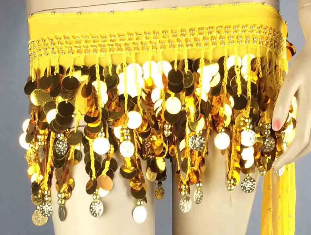 This belly dance hip scarf features vibrant sequins and coin fringe, crafted from a comfortable blend of chiffon and spandex. Ideal for tribal fusion belly dance performances, it provides an eye-catching addition to any dancewear collection with its diverse color options.