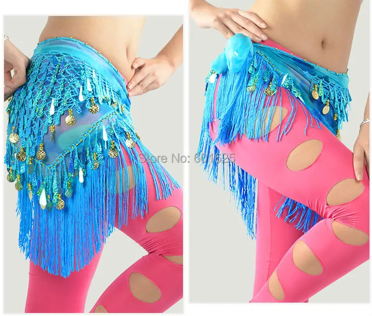 This women's belly dance hip scarf features a striking blue tie-dye design adorned with sequins and coin embellishments. Its asymmetrical tassel skirt enhances movement, making it ideal for both tribal fusion performances and practice.