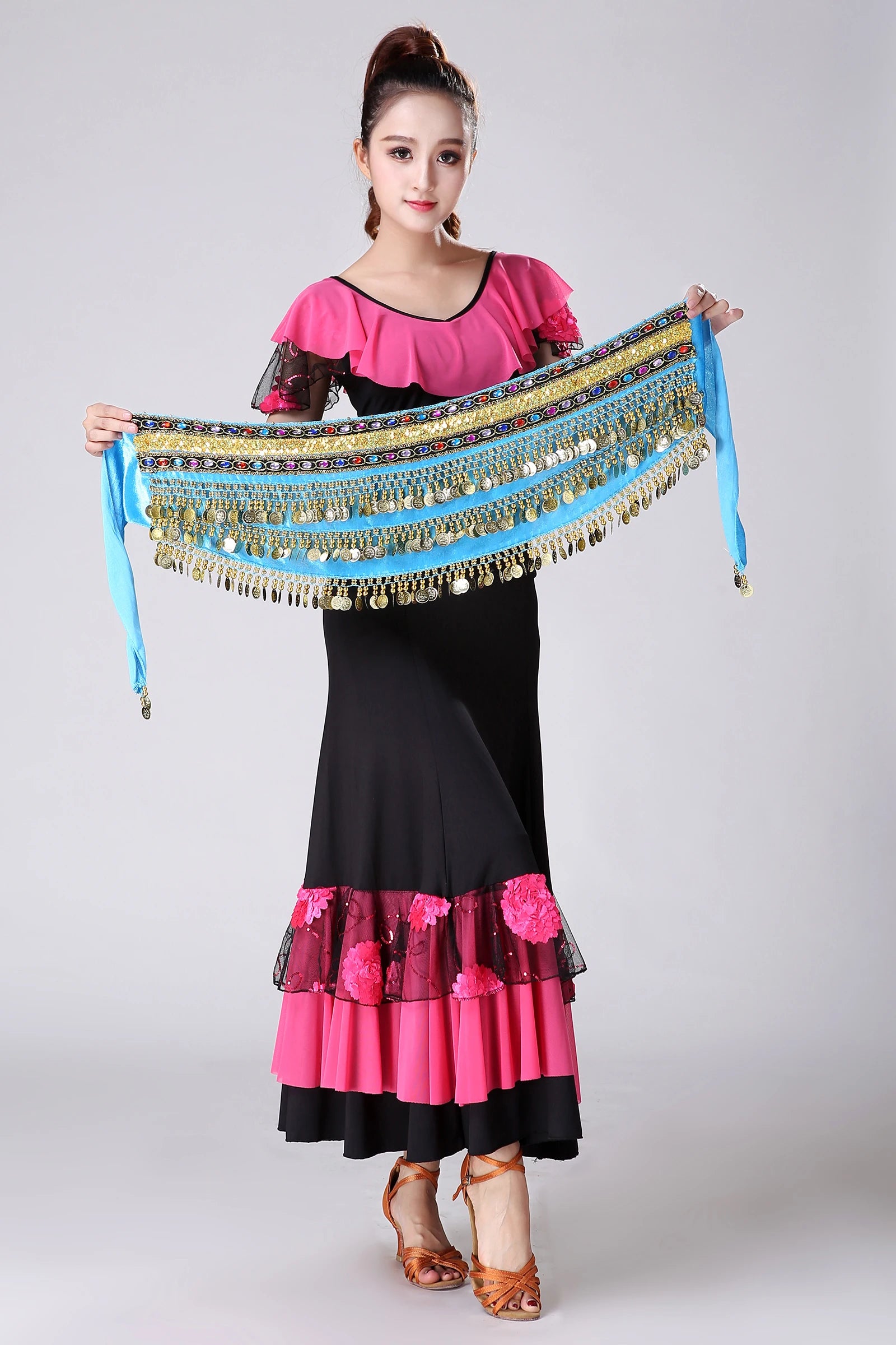 This vibrant belly dance hip scarf features a luxurious blend of velvet and chiffon, adorned with shimmering sequins and coin fringes, perfect for adding flair to your dance routine. Its adjustable fit and easy-care fabric make it a stylish yet practical choice for belly dancers of all levels.