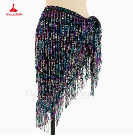 This vibrant green hip scarf features an asymmetrical design adorned with shimmering sequins and playful tassel fringes, offering an eye-catching flair to Latin dance routines. Perfect for enhancing fluid movements, this lightweight and comfortable accessory is ideal for belly dancing or other performance arts.