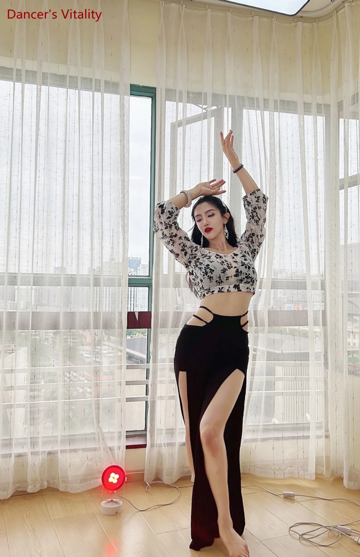 Belly Dance Outfit, Women's Black & White Floral Chiffon Crop Top & High-Slit Skirt, Modern Belly Dance Costume