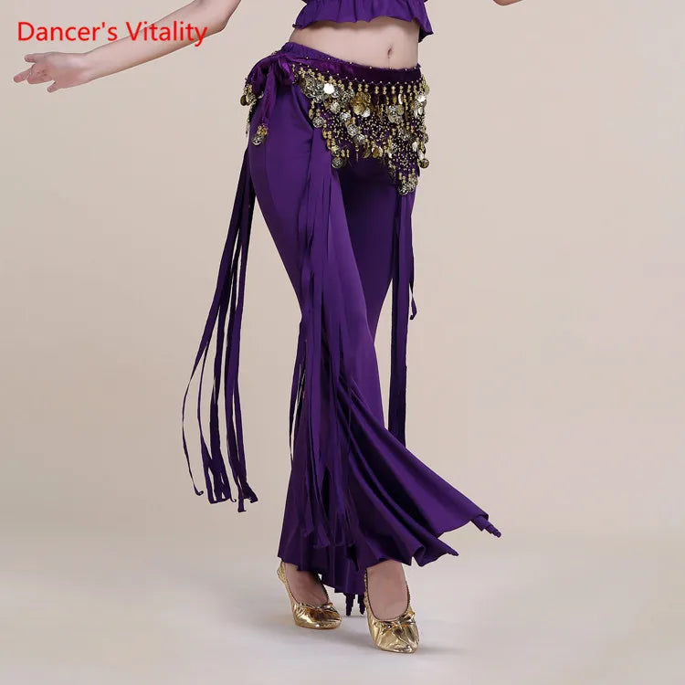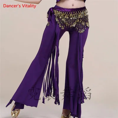 These yellow sequin belly dance pants feature a hip scarf and bell-bottom slit legs, adding sparkle and flair to oriental dance performances. The breathable material ensures comfort during movement, making them perfect for any dance routine.