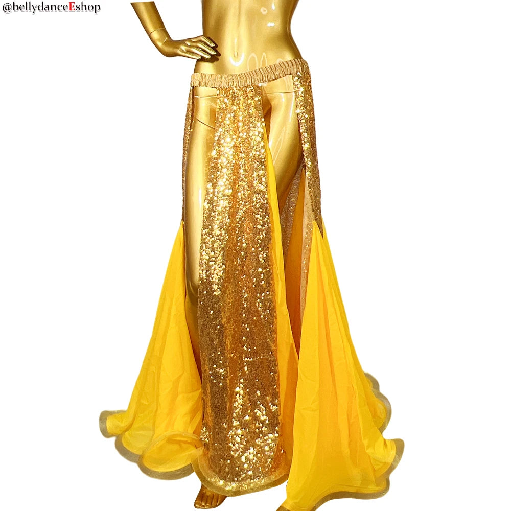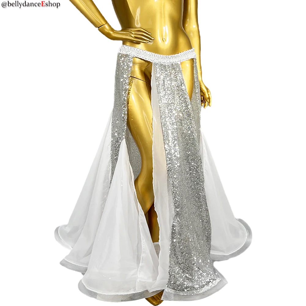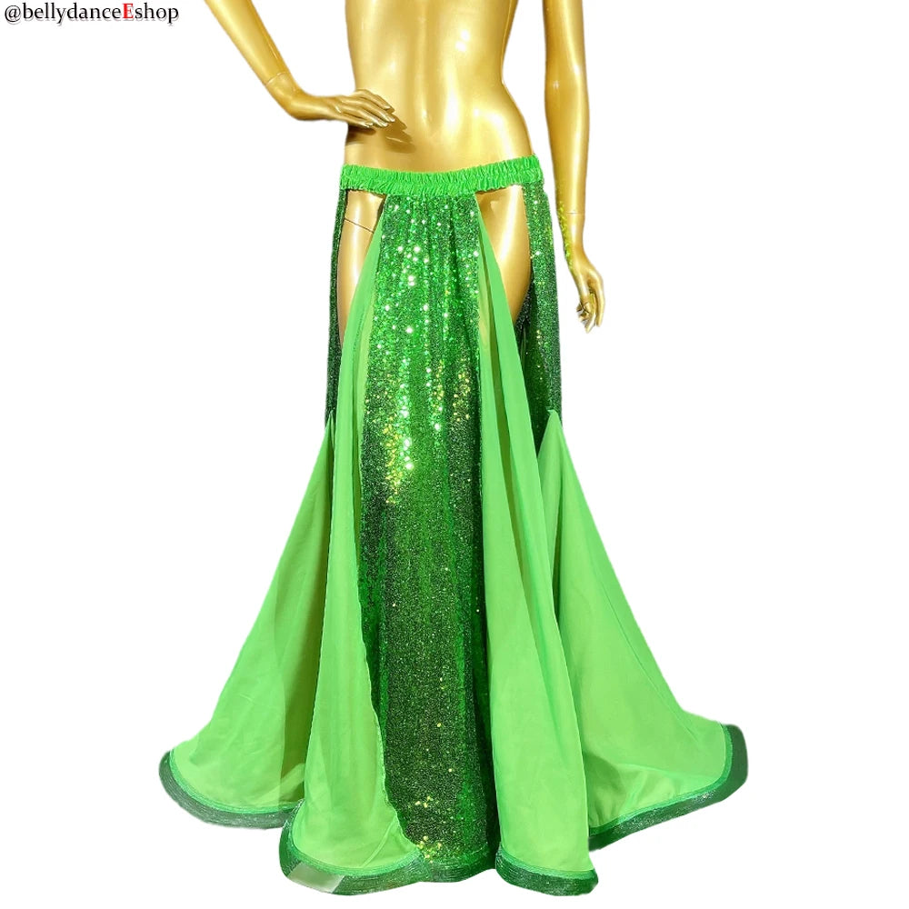 Experience elegance with this Sexy Sparkly Sequined Long Skirt, crafted from lightweight chiffon adorned with dazzling sequins. Designed with an elastic waistband for a snug fit, this skirt is perfect for belly dance performances or festive occasions.