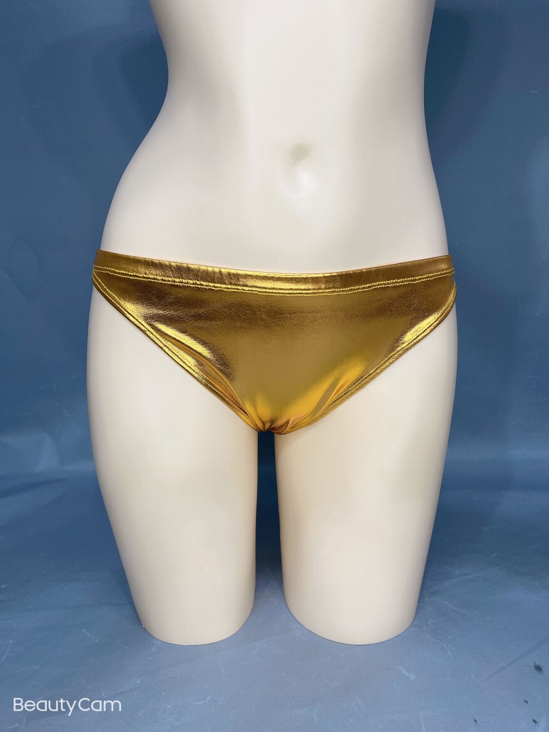 These high-cut thong bikini bottoms are designed for pole dancing, available in metallic gold and silver, offering a perfect stretch fit with ruched sides for a flattering silhouette. Custom sizing is available, and they ship from China, ensuring a unique addition to your dance wardrobe.