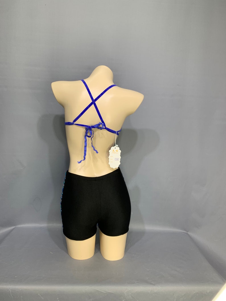 This dazzling costume set includes a striking blue sequin peacock feather halter bra and teal gemstone shorts, ideal for performances or festive occasions. Crafted with a focus on style and comfort, it offers an adjustable fit and the option for custom sizing to cater to various preferences.