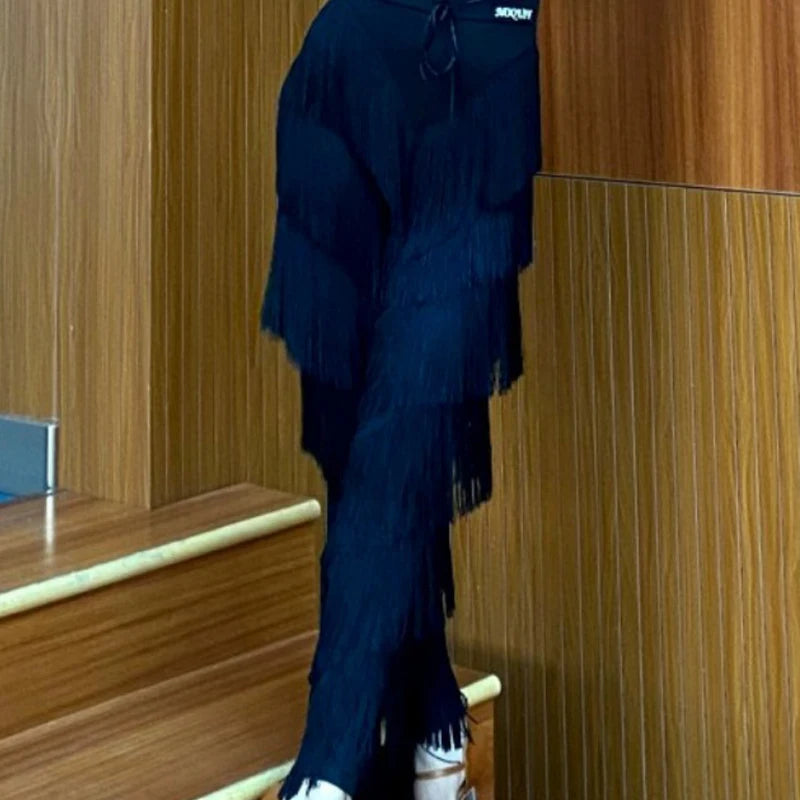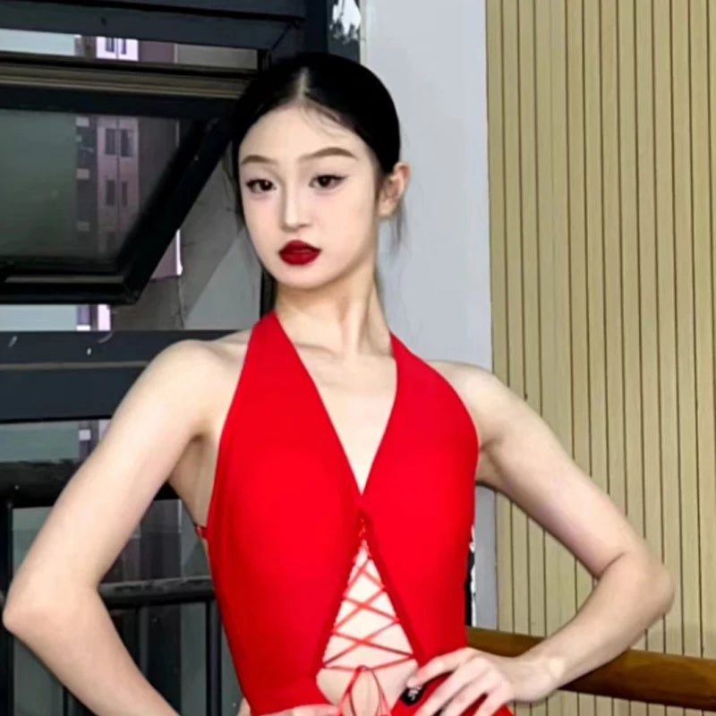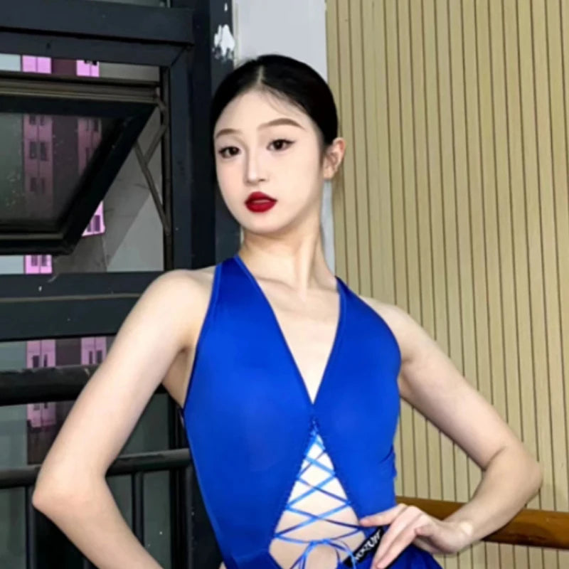 This Latin dance bodysuit for women, available in red, black, and blue, features a stylish halter neck with fringe details for a dynamic look on the dance floor. The jumpsuit is crafted with comfortable, stretchy fabric that allows ease of movement, making it perfect for performances or practice.