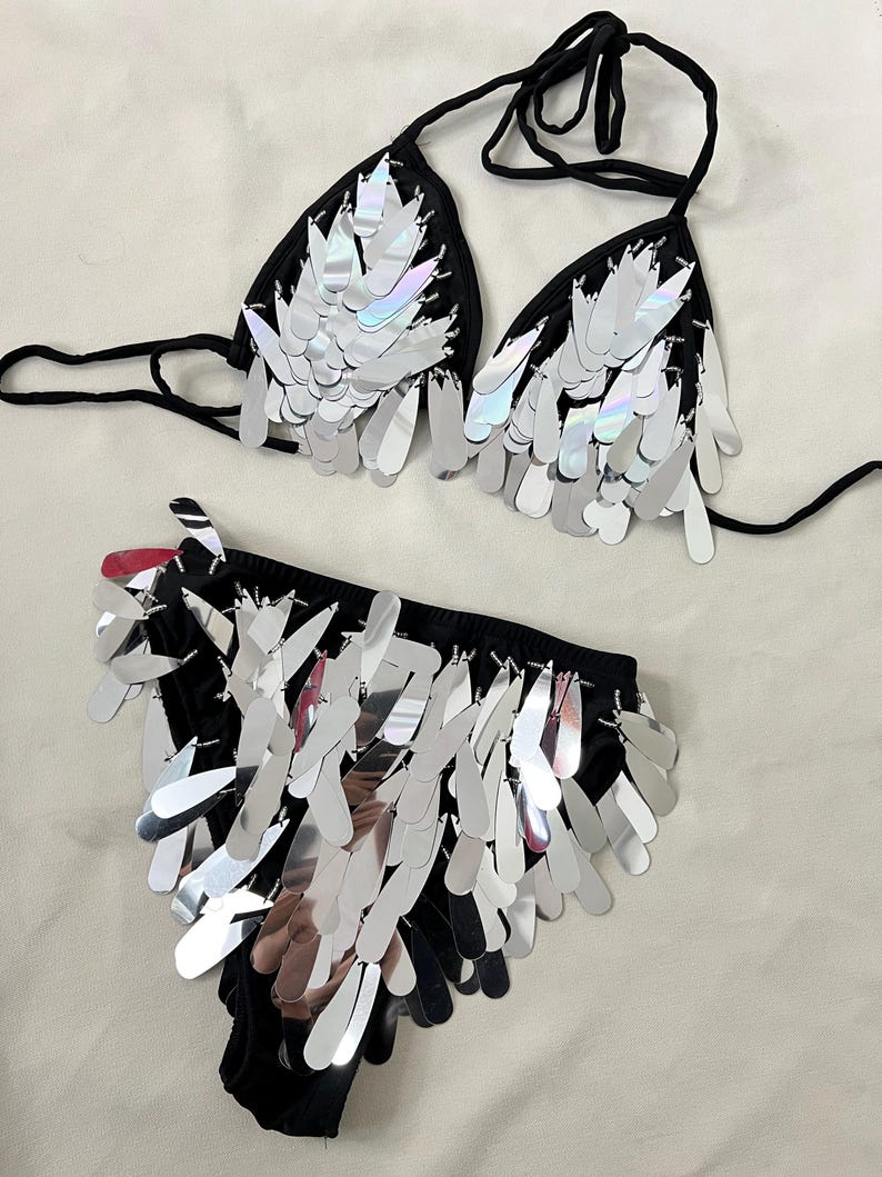 This dance two-piece set features a black and silver sequin mesh long sleeve crop top paired with high-waist bottoms, perfect for rave dancewear. The stretchy and breathable fabric ensures comfort during performances, requiring simple care instructions for maintenance.