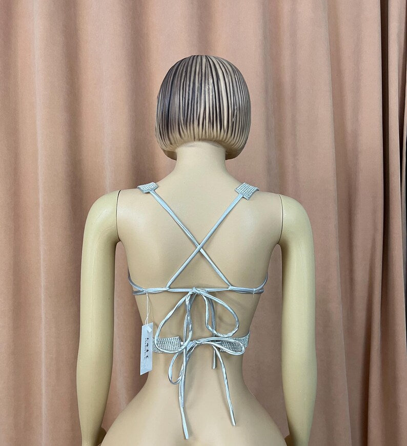 This stunning silver halter bra is crafted with rhinestone crystal embellishments, designed specifically for belly dance performances. Its intricate detailing adds a touch of elegance, making it perfect for dance routines or special occasions, with a hint of stretch for comfort.