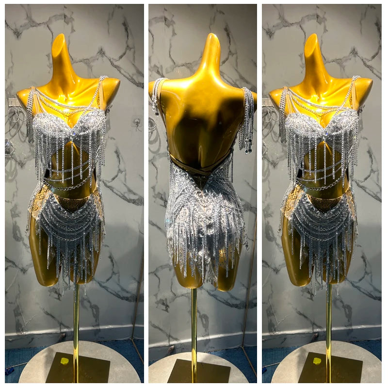 This exquisite Latin dance dress features a stylish silver rhinestone chain and fringe design, creating an eye-catching look ideal for performances. Its mini backless cut is perfect for showcasing elegance and flexibility, while being handcrafted ensures each piece is unique.