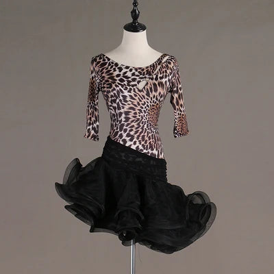 This elegant Latin dance dress features a red stretch knit fabric designed for optimal movement and comfort. The ruffled details and quarter sleeves add a sophisticated touch, while the cut-out back and backless design enhance breathability during performances.