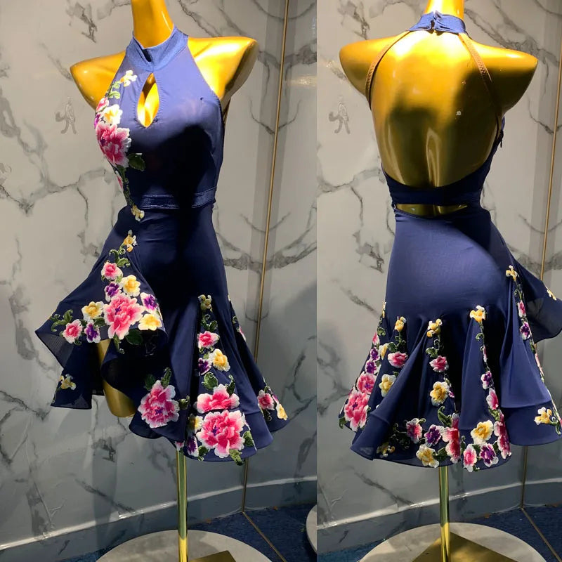 This hand-made Latin dance dress features a sophisticated mock neck design with elegant feather detailing and sparkling rhinestones, perfect for ballroom competitions and ensuring a unique fit with its customizable measurements.