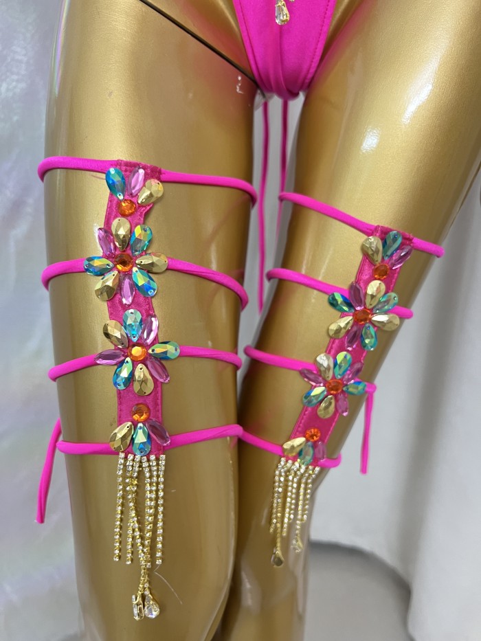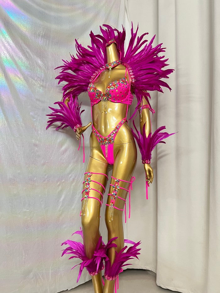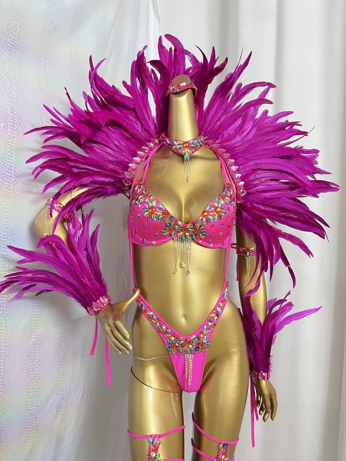 Women’s Samba Carnival Costume Set with Feather Shoulder Wings, Hot Pink Rhinestone Bikini & Leg Harness, Festival Parade Performance Outfit