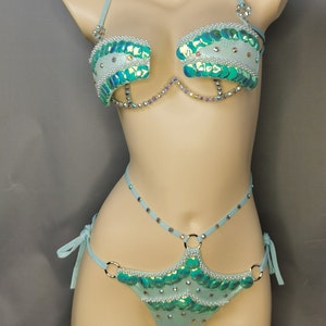 This aqua bikini set is crafted from dazzling sequins, pearls, and rhinestones, perfect for belly dance or burlesque performances. The versatile halter design provides a flattering fit with sizes available for a comfortable experience.
