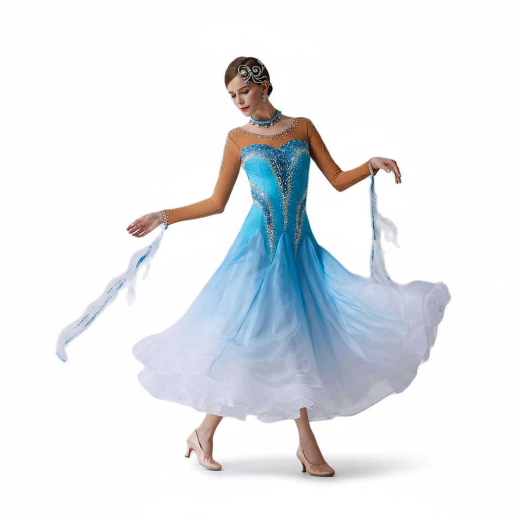 Designed for ballroom elegance, this long-sleeve dress pairs a stretchy Lycra bodice with a lightweight organza skirt and lace detailing for a supportive fit and graceful movement. Ideal for waltz, tango, practice or competition, it offers breathable comfort, subtle rhinestone sparkle, and easy care—hand wash cold and dry flat.