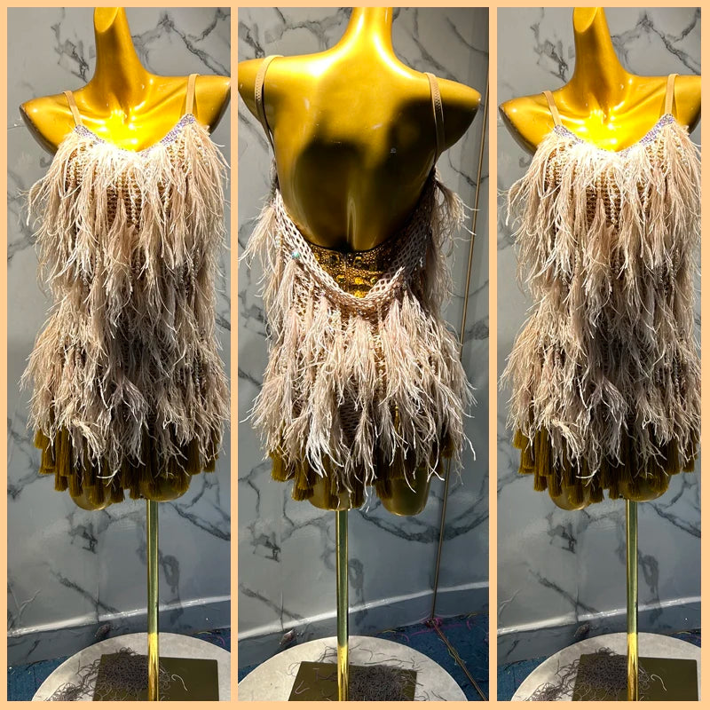 This elegant Latin dance dress features a stunning beige ostrich feather fringe and open back design, hand-made from premium materials to ensure a unique fit. Perfect for performance wear, it requires care during cleaning to maintain its intricate detailing.