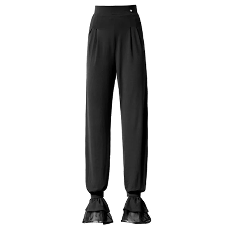 This women's jumpsuit features elegant black and brown sheer sleeves with ruffled details and velvet buttons, perfect for Latin dance. The material offers a comfortable fit while maintaining a stylish appearance, ideal for both performance and practice.