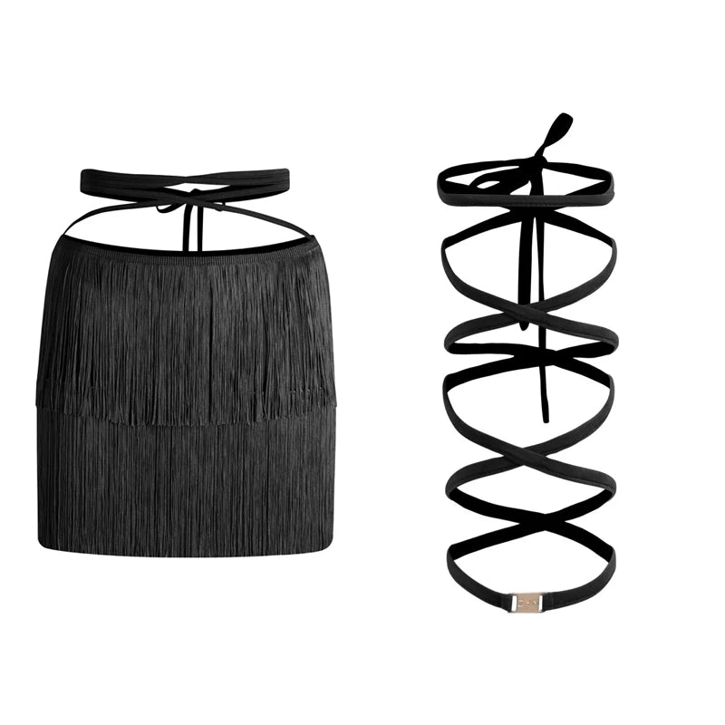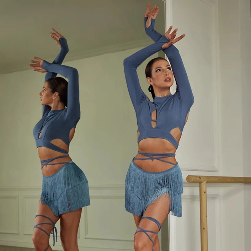 This elegant black dress is perfect for Latin dance performances, featuring a stylish cold shoulder design with fringe and criss-cross cut-outs. Made from a stretchy, comfortable fabric, it allows for freedom of movement, and can be easily cared for by hand washing or dry cleaning.